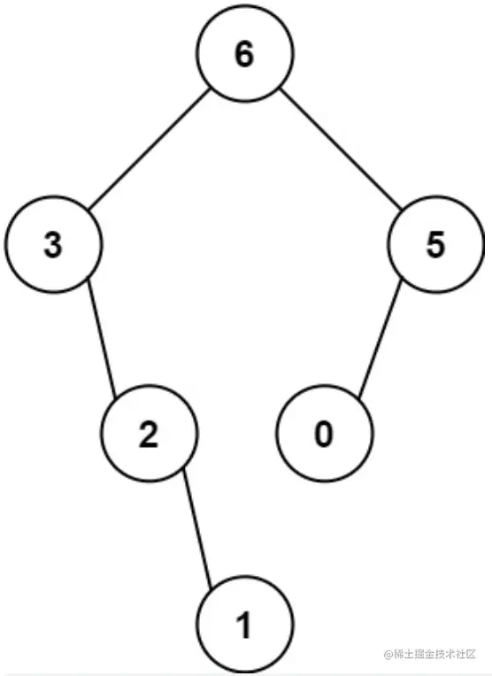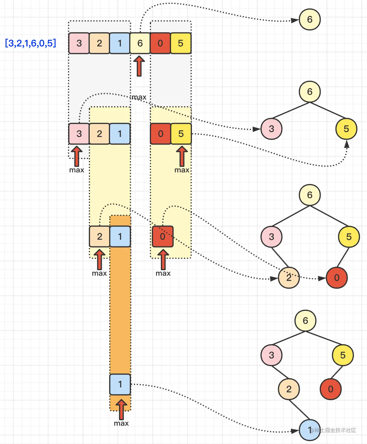 - [3,2,1,6,0,5] 中的最大值是 6 ,左边部分是 [3,2,1] ,右边部分是 [0,5]