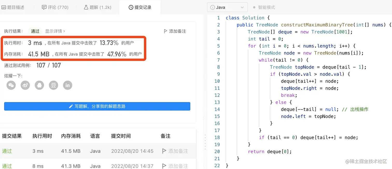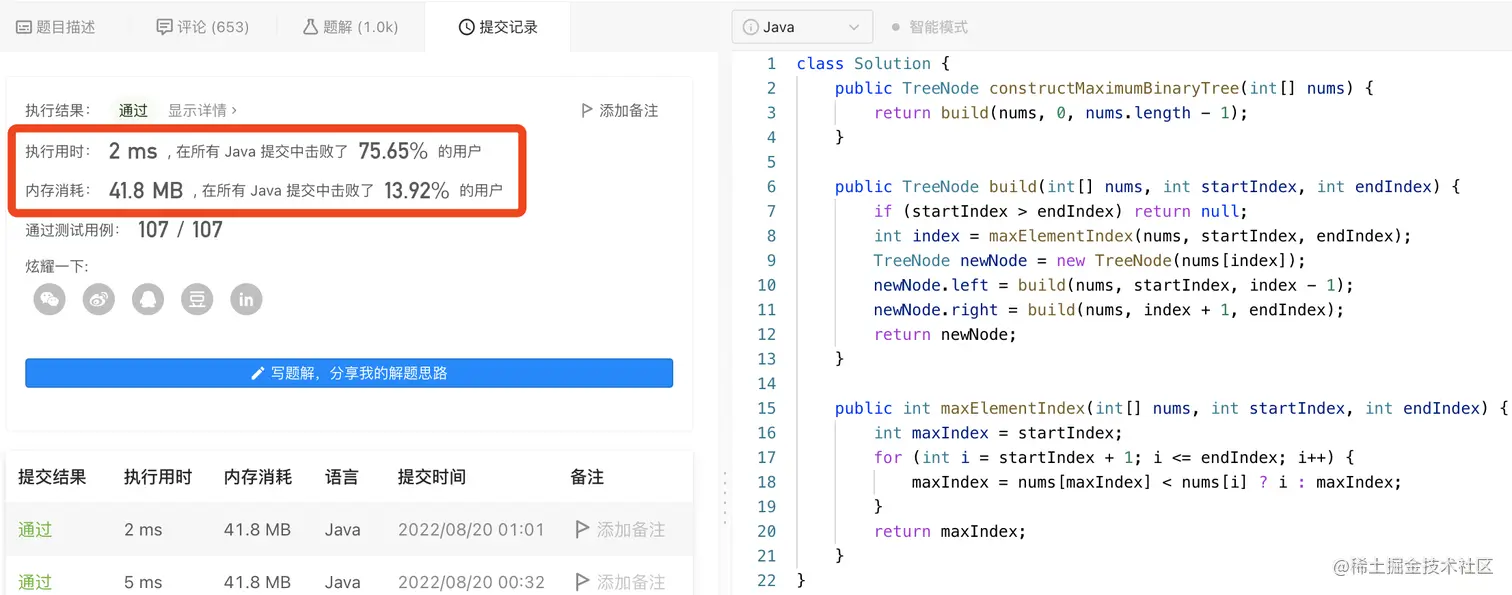 对于单调栈具体实现,逻辑上会没有思路1那么直观,特点其实就在于仅需对数组进行一次遍历,就可以构造好题目中所要求的二叉树结构。具体代码实现请参照 4.2> 实现2:单调栈