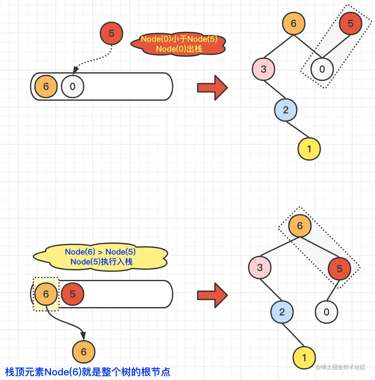 最后,我们遍历到了Node(5),由于Node(5)大于当前栈顶元素Node(0),所以Node(0)执行出栈操作,并维护二叉树结构Node(5).left = Node(0);在对比Node(5)小于当前栈顶元素Node(6),所以,Node(5)直接入栈即可。维护二叉树结构Node(6).right = Node(5)。具体操作,如下图所示: