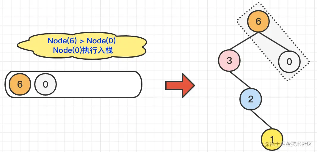 我们继续遍历到Node(0),由于Node(0)小于栈顶元素Node(6),所以Node(0)直接入栈就可以了。但是,别忘记维护一下二叉树,也就是说,配置一下Node(6).right = Node(0)。具体操作,如下图所示:
