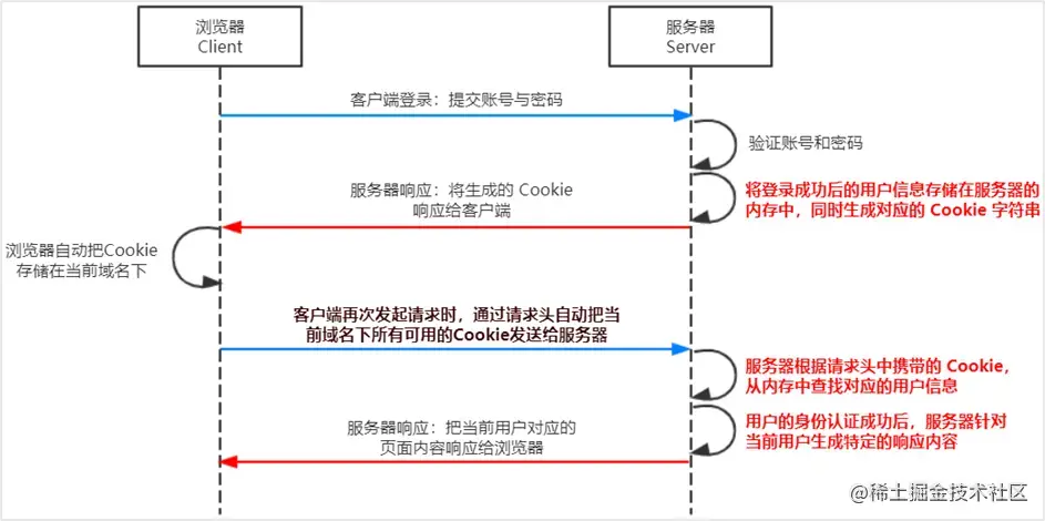 在登陆注册时,客户端会先将密码和账号发给服务端server,sever会验证密码和账号,并返回一个session_id给client,并且server也会把这个session_id存在数据库中,当client再次发送请求时,会携带该域名下的所有cookie给server,如果其中有用户的信息的session_id,server会拿取这个session_id到数据库查找对应的用户名和密码,如果与client的用户名密码一致,server才能验证成功身份返回对应的内容。