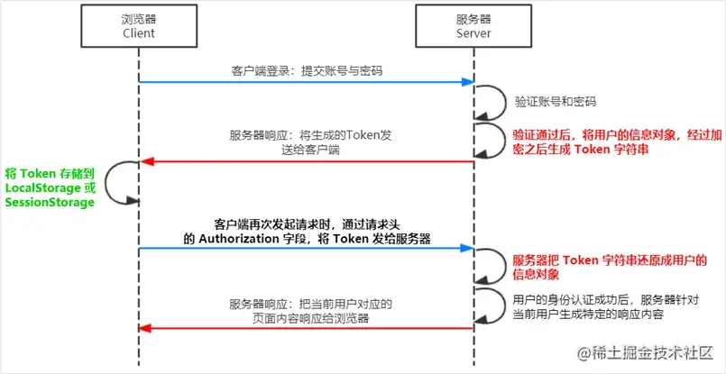 首先client会发送用户名和密码给server,server会根据自己服务器内的secret密钥 + client的用户名和密码,通过哈希加密算法,生成一段JWT字符串,并且把这段字符串放回给client。此时这段JWT字符串server是不需要保存在数据库或这服务端的。那server是如何验证的呢?在下一次client提交用户名密码时会携带上之前生成的JWT字符串,server只需要在次通过哈希加密算法,来生成一段新的JWT字符串,在将这段新的字符串与client发回来的JWT字符串进行比对,如果一致的话,则验证成功。