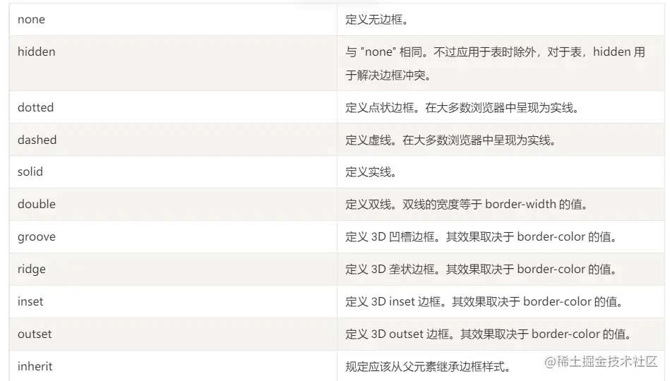 边框样式: 边框样式属性指定要显示什么样的边界, border-style属性用来定义边框的样式