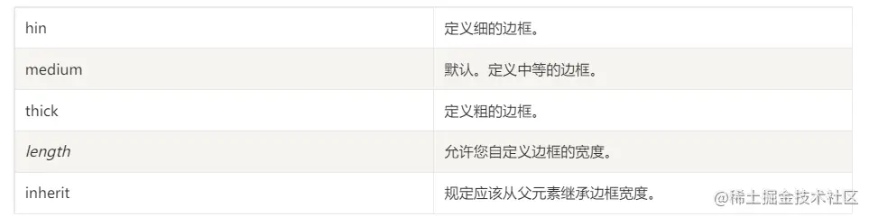 为边框指定宽度有两种方法:可以指定长度值,比如 2px 或 0.1em(单位为 px, pt, cm, em 等),或者使用 3 个关键字之一,它们分别是 thick 、medium(默认值) 和 thin。