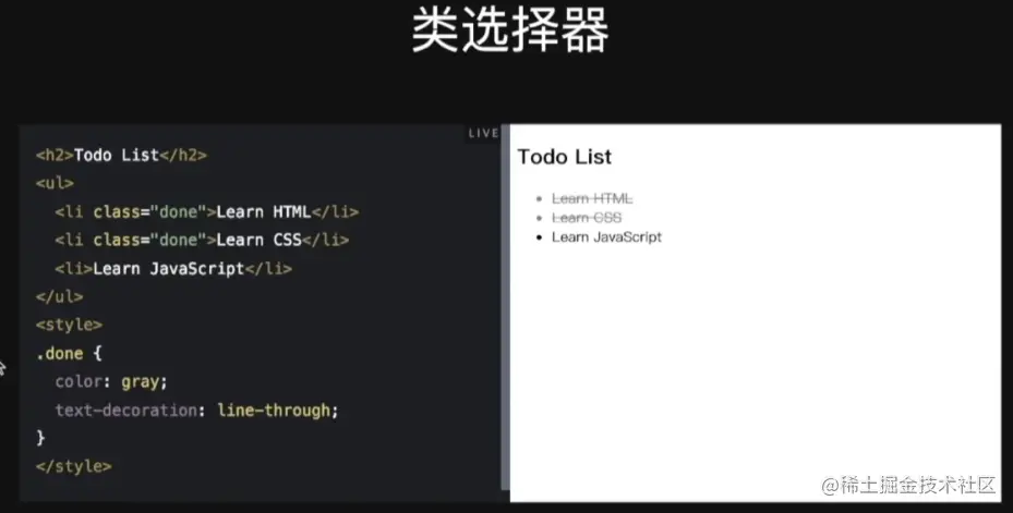 类选择器: 选中所有相同类名的标签, 为同一类型的标签添加样式时使用.
