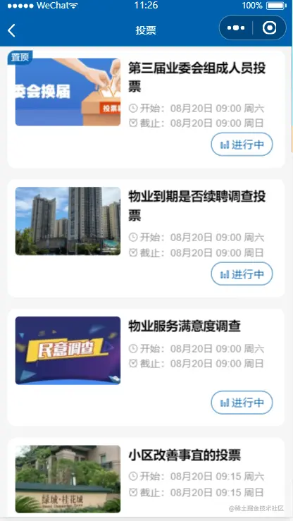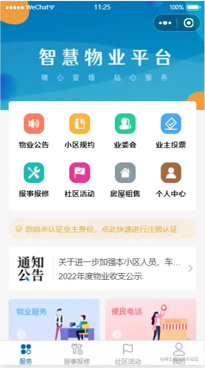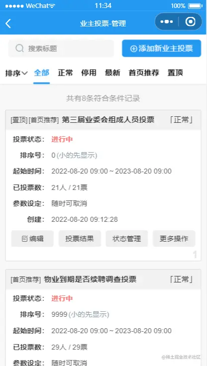 - 投票:支持录入投票项目,业主按单选多选投票,后台查看投票结果等