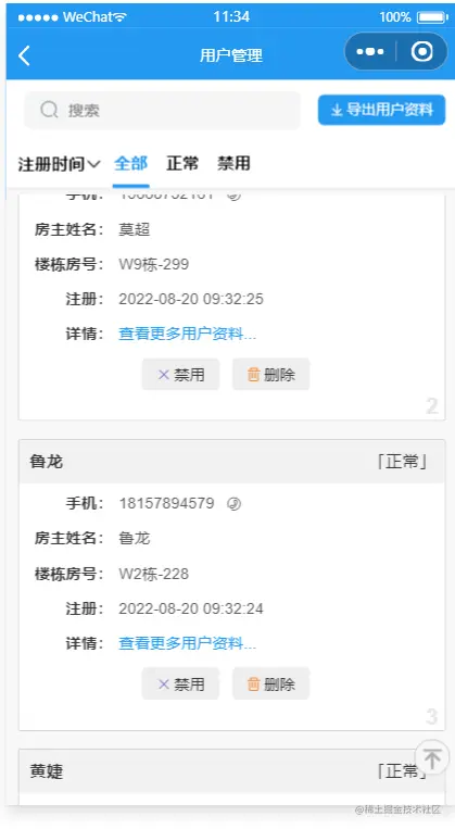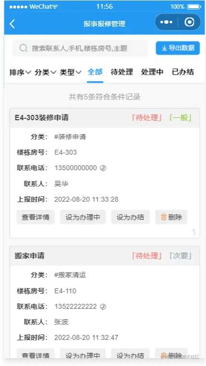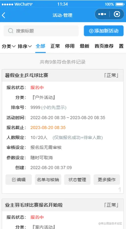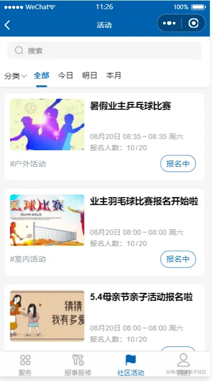 - 社区活动报名:支持录入社区活动,提交报名,用户扫码签到,工作人员核销签到,导出报名名单Excel等