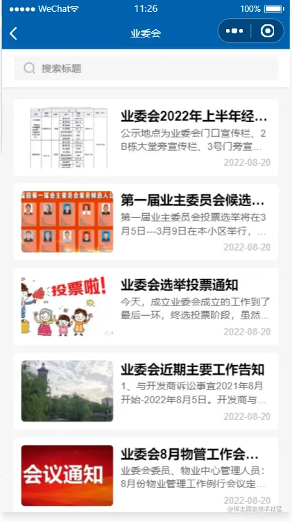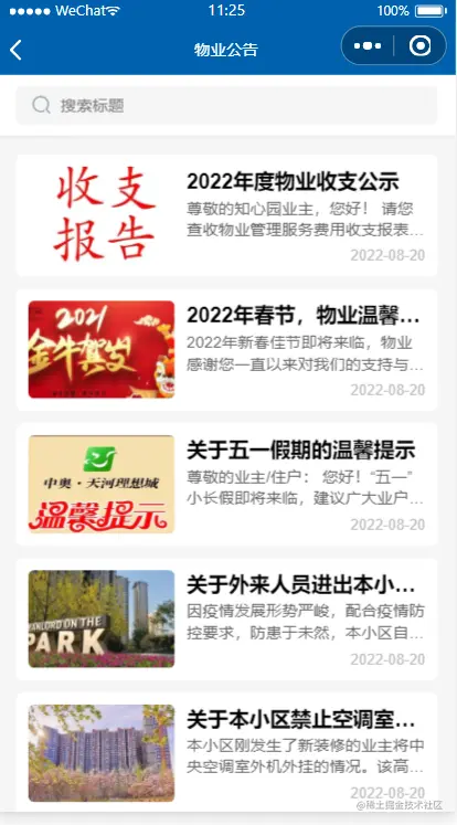 - 资讯管理:录入和展示物业公告,业委会公告,租售信息,小区规章制度等
