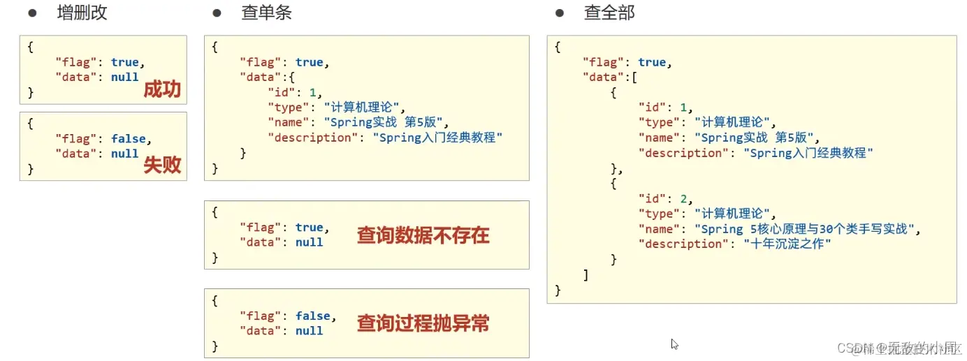 将所有的数据都封装在data中,但是当查询到的数据为null时,不一定是数据库中没有相应数据,可能是操作执行失败,导致没有搜索到数据,所以又加了个flag,用来判断操作是否执行成功。