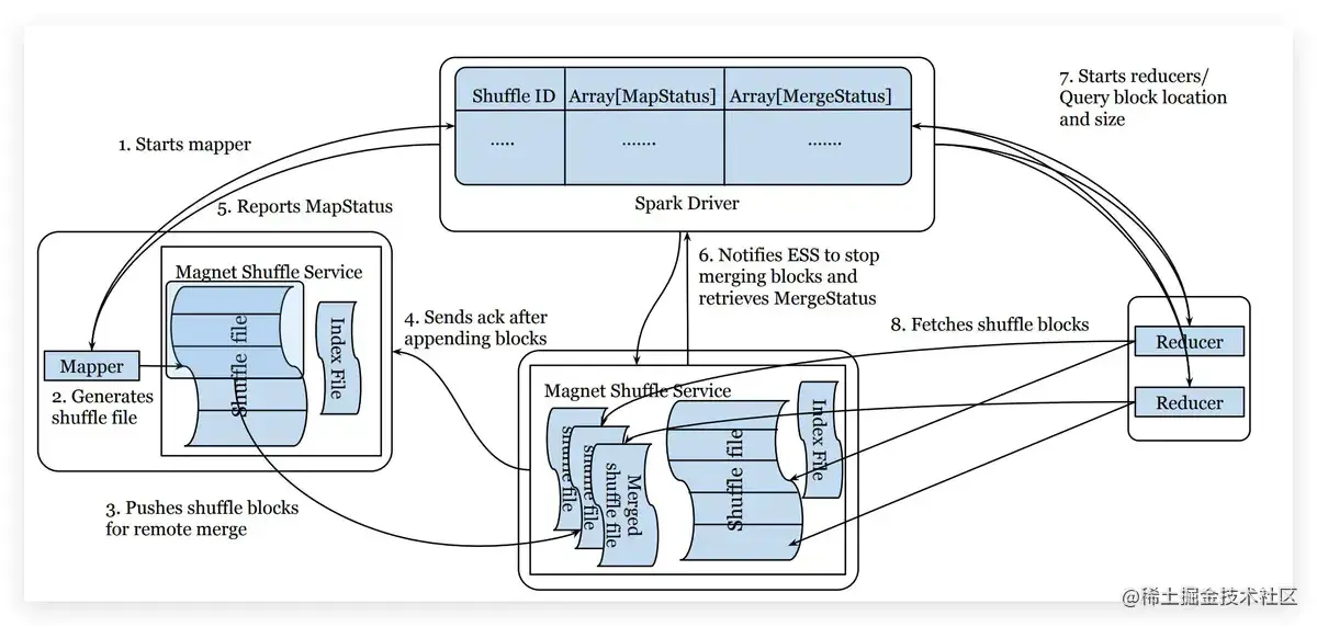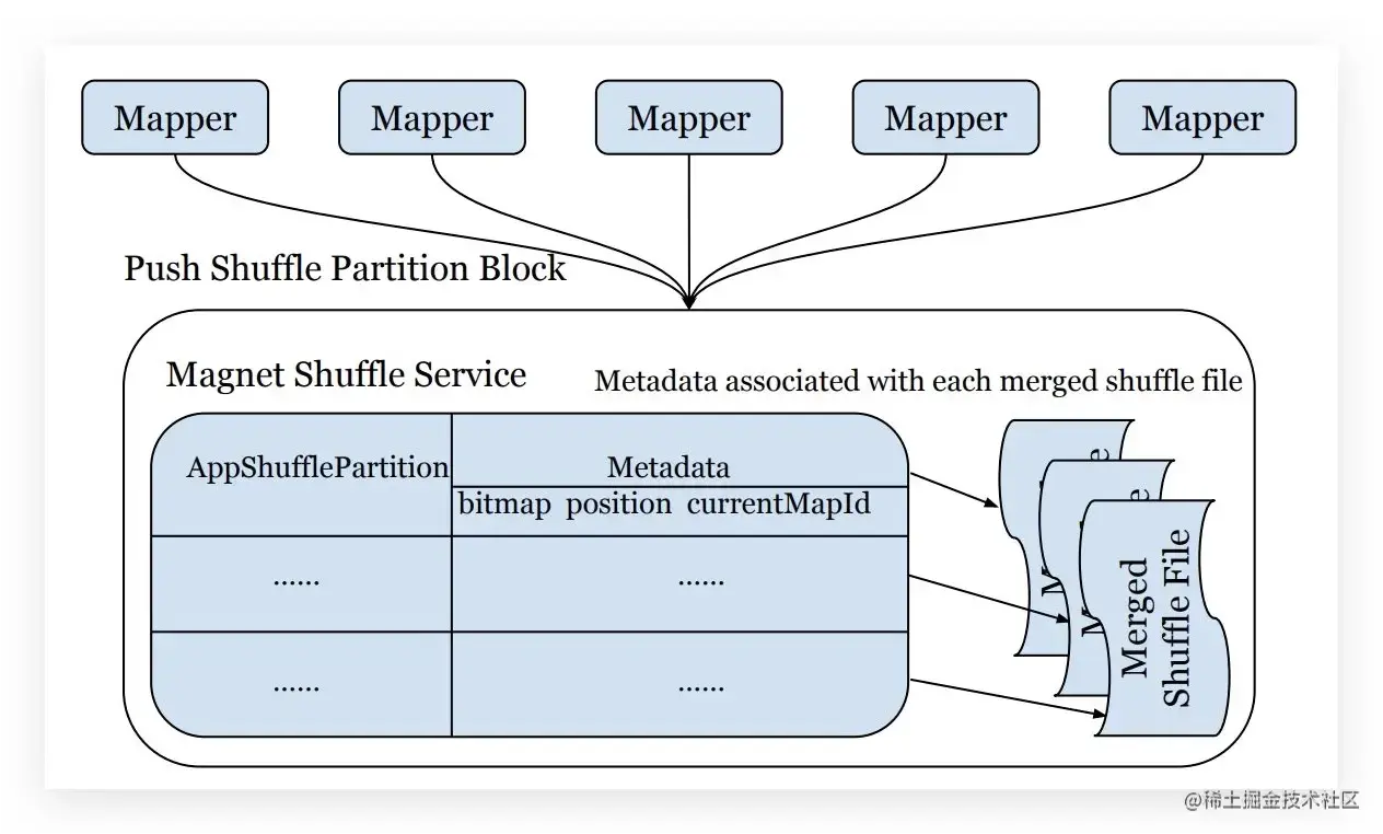 主要为边写边push的模式,在原有的shuffle基础上尝试push聚合数据,但并不强制完成,读取时优先读取push聚合的结果,对于没有来得及完成聚合或者聚合失败的情况,则fallback到原模式。