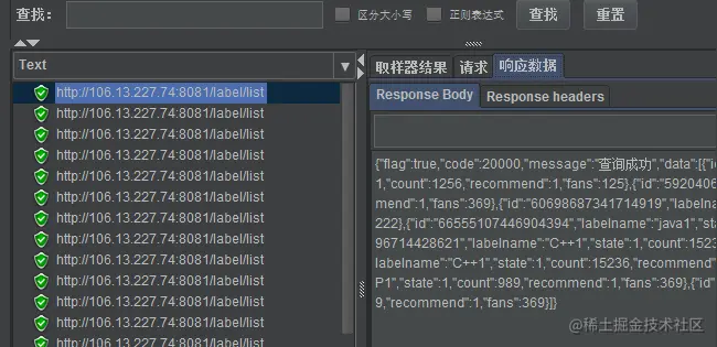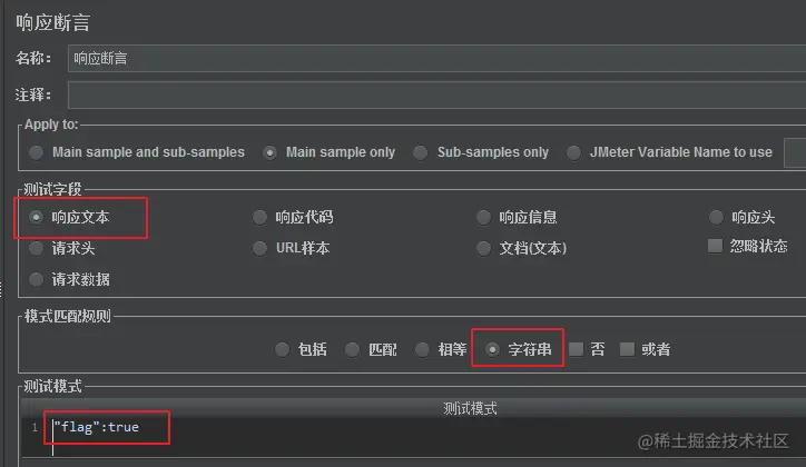 有测试模式中的文本, 即断言成功. 这个模式下可以写正则表达式. - 字符串 : 响应中