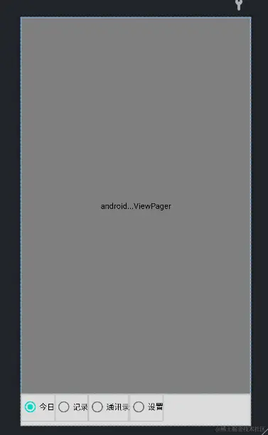 RadioGroup + ViewPager:这是一种比较常见了的,下面 4 个tab的导航按钮,可以切换不同的页面,实现了滑动的页面效果。示例图:<RelativeLayout xmlns:android="http://schemas.android.com/apk/res/android" xmlns:tools="http://schemas.android.com/tools" android:layout_width="match_parent" android:layout_height="match_parent" tools:context=".style2.Style2Activity"> <android.support.v4.view.ViewPager android:id="@+id/fragment_vp" android:layout_width="match_parent" android:layout_height="match_parent" android:layout_above="@+id/tabs_rg" /> <RadioGroup android:id="@+id/tabs_rg" android:layout_width="match_parent" android:layout_height="56dp" android:layout_alignParentBottom="true" android:background="#dcdcdc" android:orientation="horizontal"> <RadioButton android:id="@+id/first_tab" style="@style/Custom.TabRadioButton" android:checked="true" android:drawableTop="@drawable/tab_sign_selector" android:text="首页" /> <RadioButton android:id="@+id/record_tab" style="@style/Custom.TabRadioButton" android:drawableTop="@drawable/tab_record_selector" android:text="记录" /> <RadioButton android:id="@+id/contact_tab" style="@style/Custom.TabRadioButton" android:drawableTop="@drawable/tab_contact_selector" android:text="联系" /> <RadioButton android:id="@+id/settings_tab" style="@style/Custom.TabRadioButton" android:drawableTop="@drawable/tab_setting_selector" android:text="设置" /> </RadioGroup> </RelativeLayout>