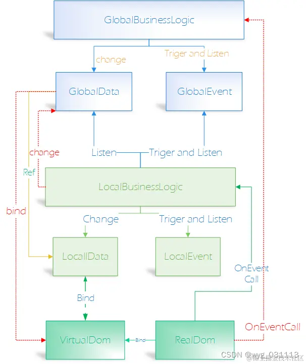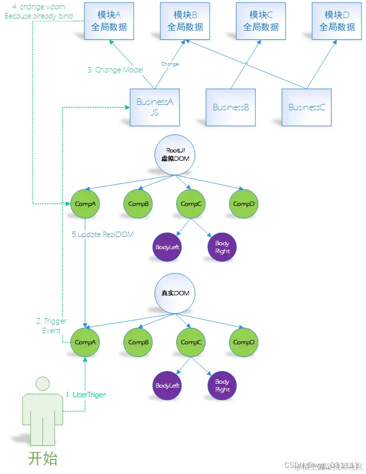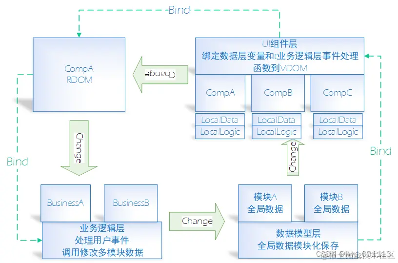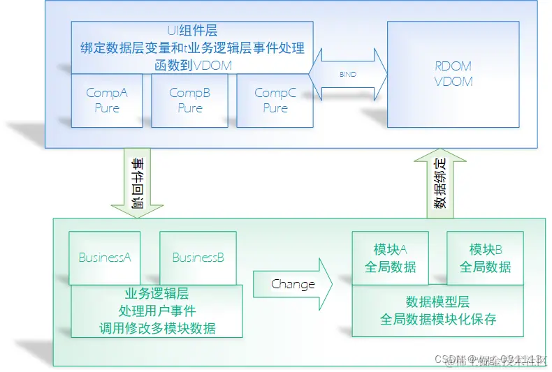 用户事件送达business模块。一般通过事件中心来解决。 也可以像数据一样,把回调函数也当数据一样,绑定到RDOM的如OnClick函数等上去。这个回调函数可以只是抛一个事件,也可以直接处理业务逻辑。
