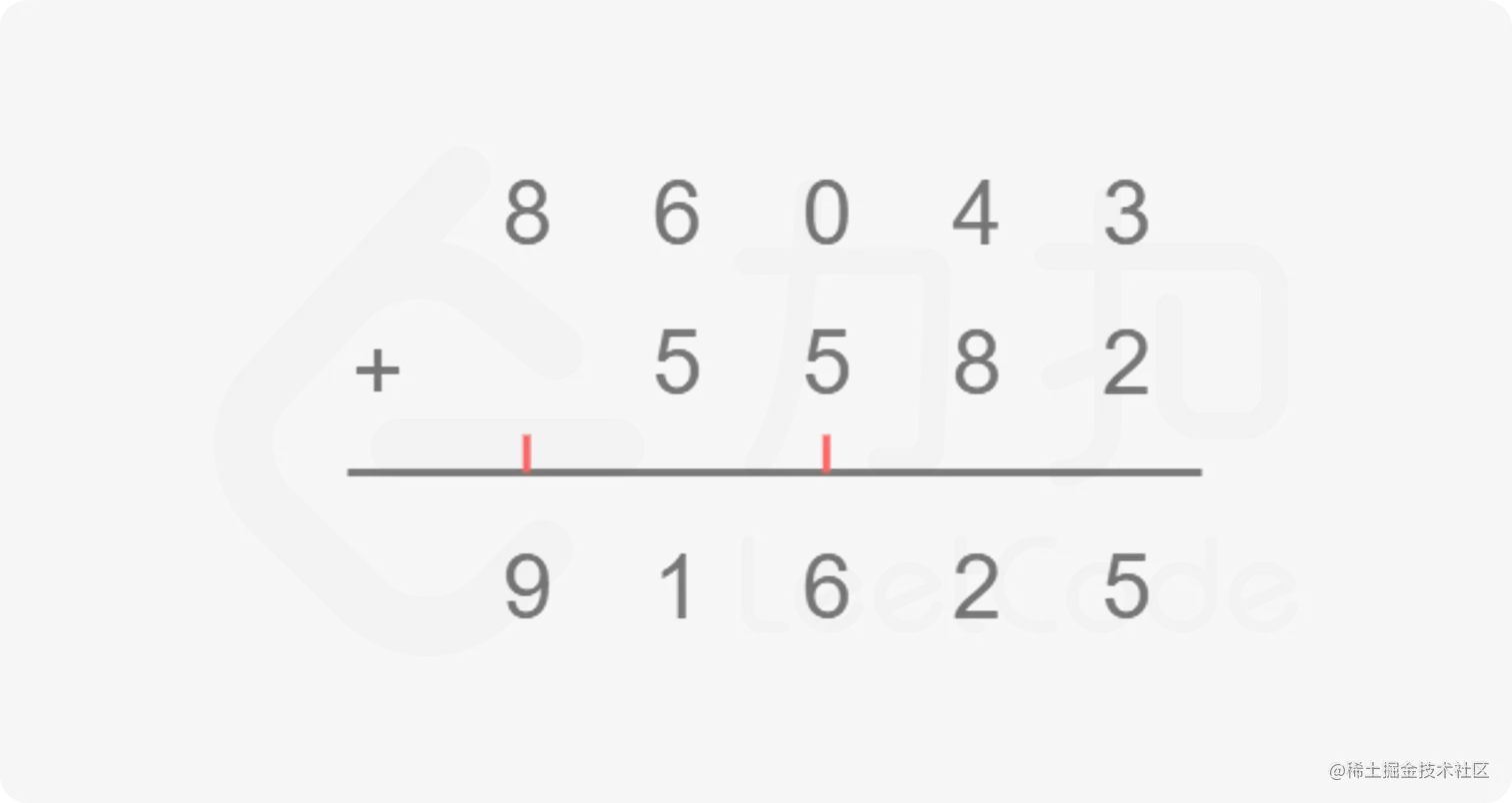 我们统一在指针当前下标处于负数的时候返回 0,等价于对位数较短的数字进行了补零操作,这样就可以除去两个数字位数不同情况的处理。