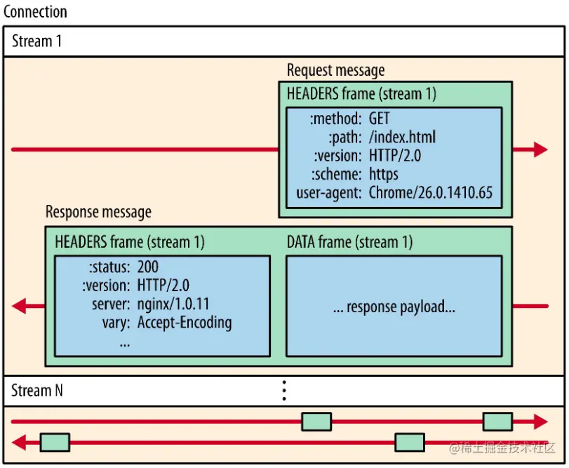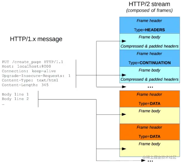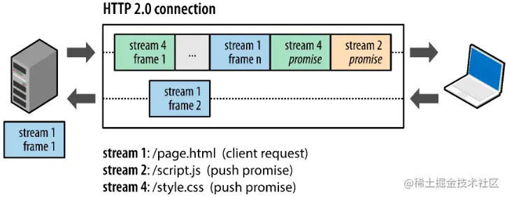 帧(frame) : HTTP/2通信的最小单位,每个帧都包含帧头,至少也会标识出当前帧所属的数据流。