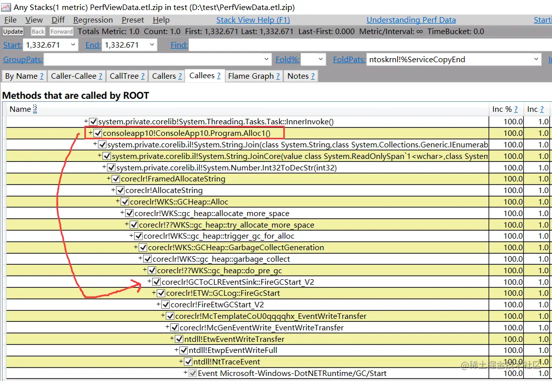 从输出中可以看到,当前触发的GC的操作是由于 ConsoleApp10!ConsoleApp10.Program.Alloc1+0xbc 方法所致,原因是由于0代阈值用完,但这种调试 CoreCLR 源码的方式终究还是侵入性较大,那有没有自动帮我收集分配 线程调用栈 的工具呢? 这就需要借助 PerfView 啦。