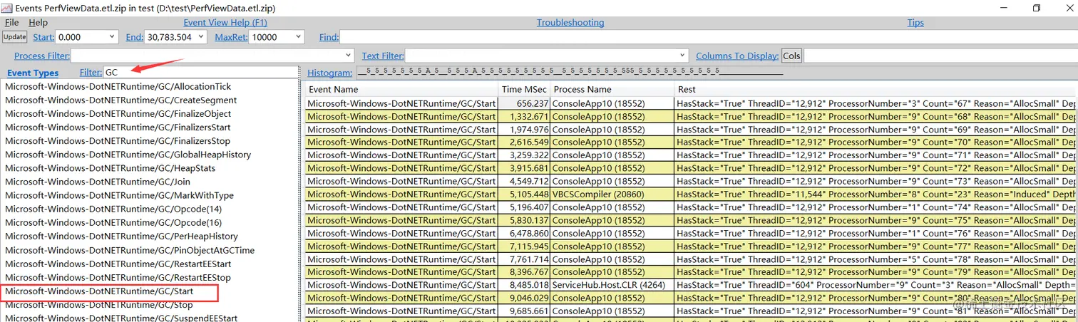 Windows 系统内置强大的事件跟踪机制(ETW)再次显示出了威力,我们可以用 PerfView 去拦截 GC 的触发事件,并同时记录此时事件触发的调用栈,而且对应用程序的开销非常小。