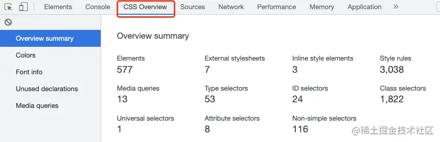 CSS Overview Panel 直译过来就是 CSS 概览面板,它是从 Chrome 87 开始支持的一项实验室功能。