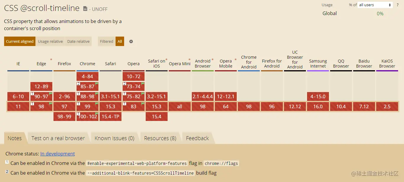 @scroll-timeline 虽好,目前仍处于实验室特性时间,Chrome 从 85 版本开始支持,但是默认是关闭的。
