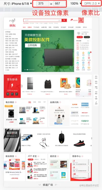 当我们写上meta标签后,width=device-width 使css像素和设备独立像素联系了起来,即css像素等于设备独立像素。在iPhone6下,即: