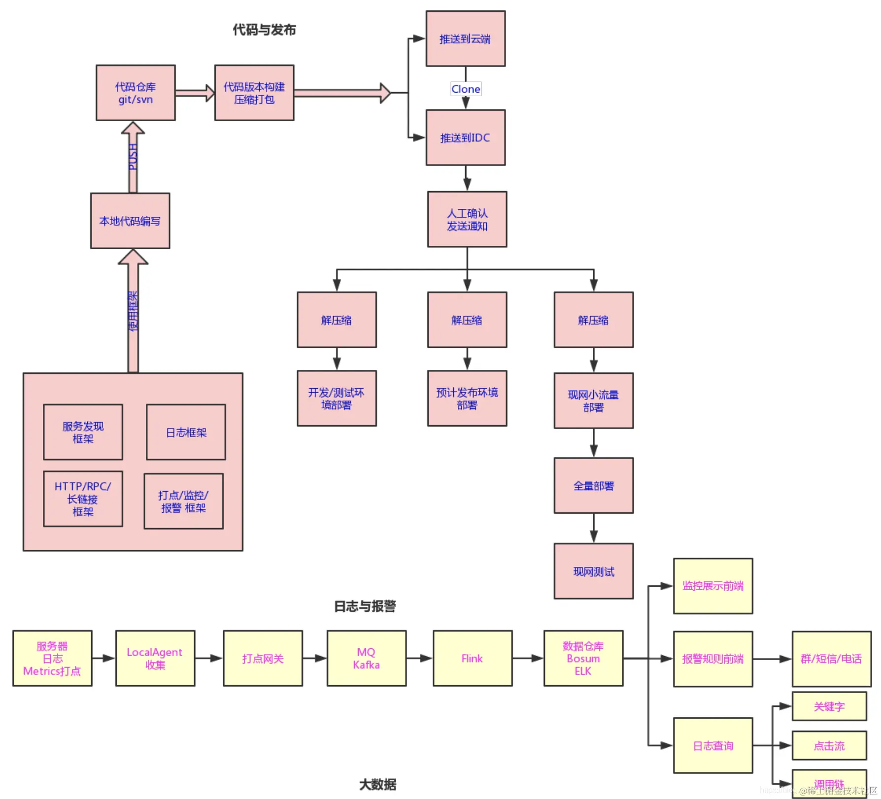 - 推送与发布:构建完成后会把构建生成的软件包,或者k8s镜像上传到集中的管理平台。发布时,各个IDC机器会下载软件包或者拉取镜像来更新。