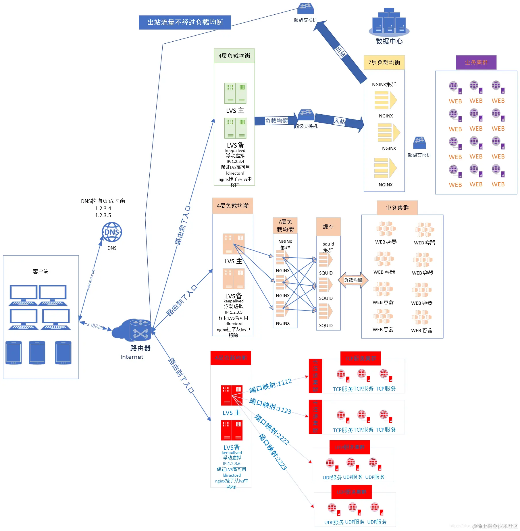 客户的数据包是怎么进入到服务器程序的?一般在企业级网关入口处是一个LVS负载均衡器。也叫4层负载均衡,针对的是upd和tcp两个传输层协议。 进入到内部,如是web应用,就会用到nginx反向代理,也叫7层负载均衡。再往后才是用户的服务器,当然也可能还有一层应用级负载均衡。