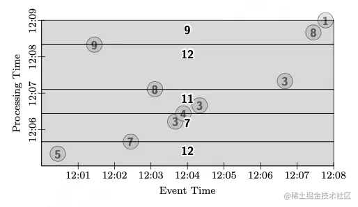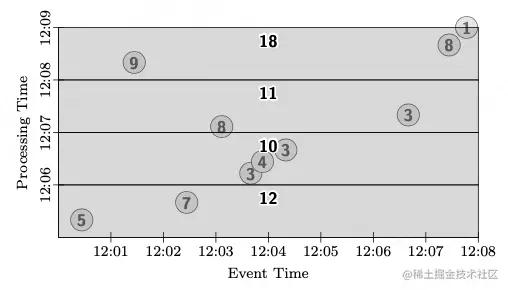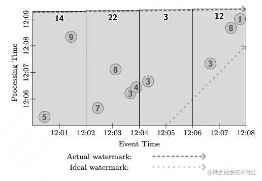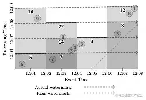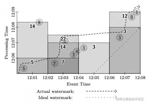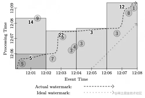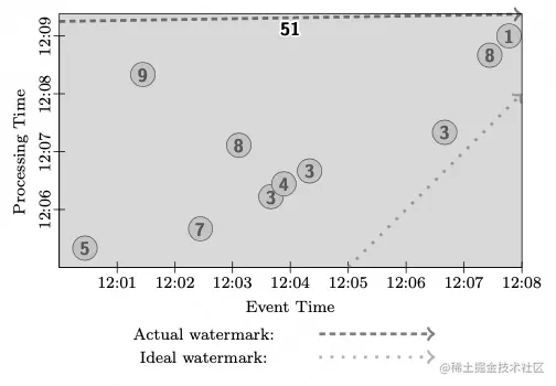 可以看到处理时间一般晚于事件时间。ideal 的情况下,差距越小越好。