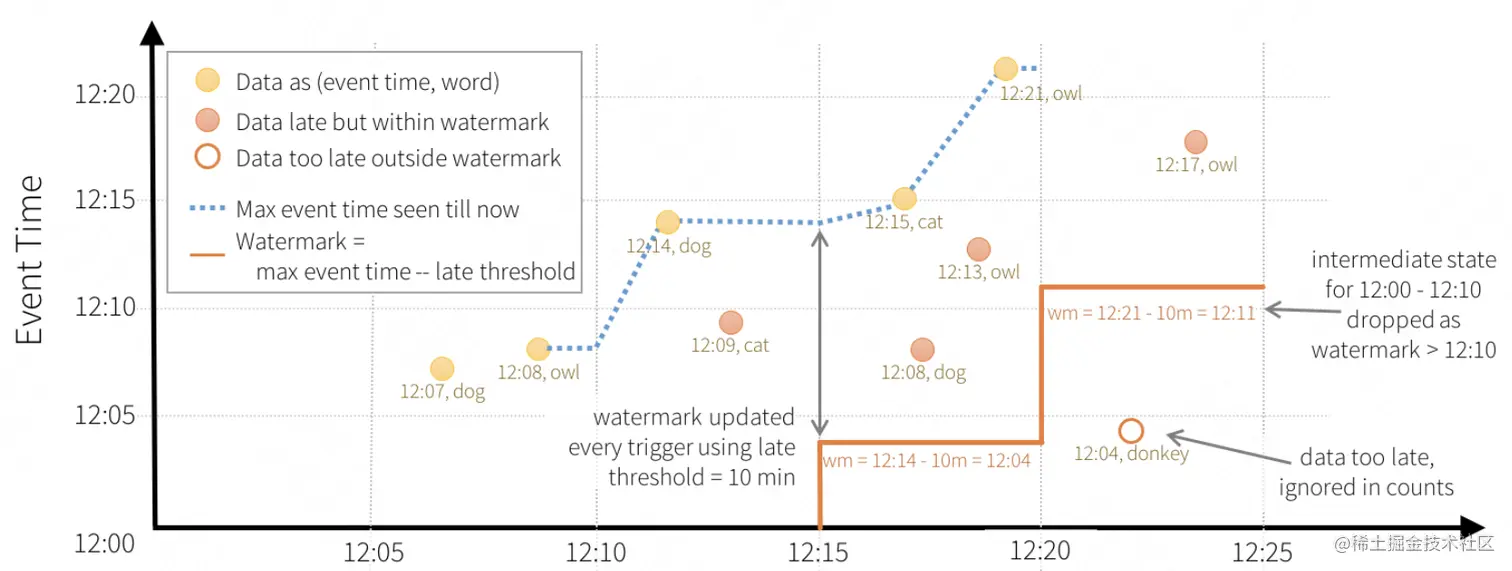 当watermark 更新到某个时间值时,我们可以认为所有时间戳小于watermark的数据都已经到达了。