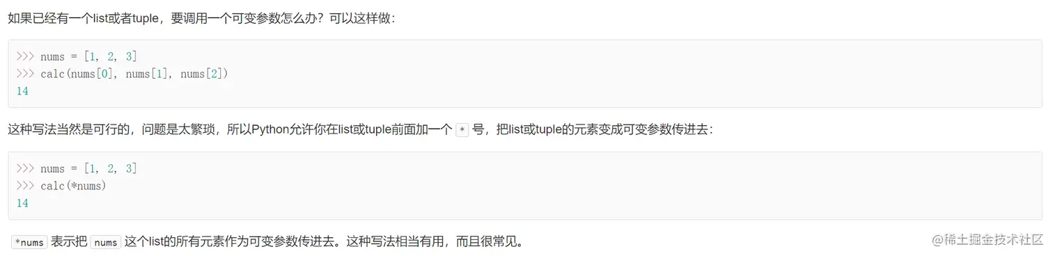 - 参数展开:调用函数时括号里的参数加 * :自动把 list 或 tuple 展开