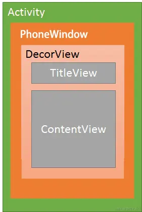 - DecorView:顶层视图,将要显示的具体内容呈现在PhoneWindow上. DecorView是当前Activity所有View的祖先,它并不会向用户呈现任何东西