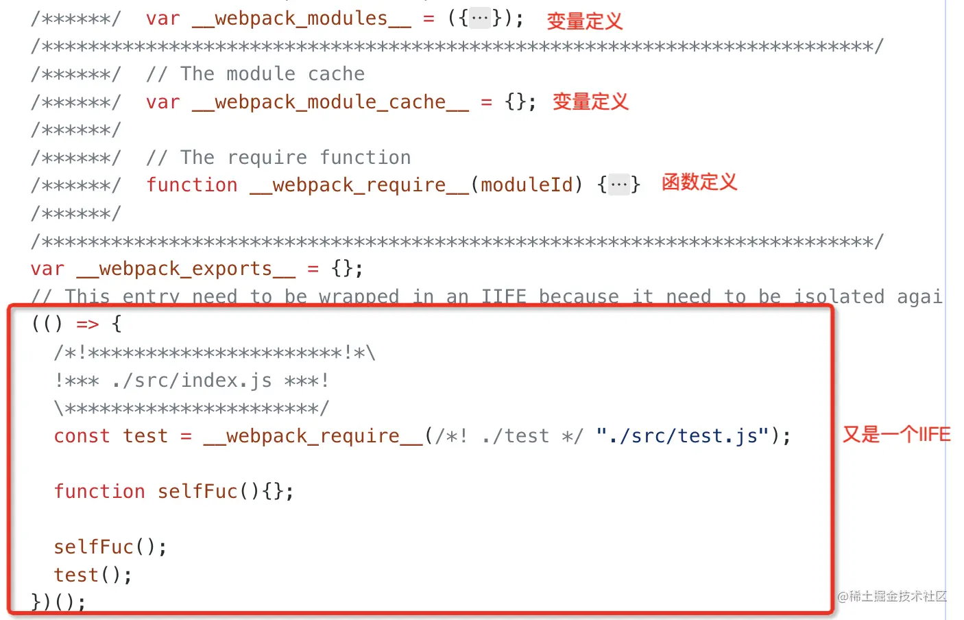 __webpack_module_cache__对象、__webpack_require__、__webpack_require__.d、__webpack_require__.o、__webpack_require__.r函数。 - 执行最后的IIFE。