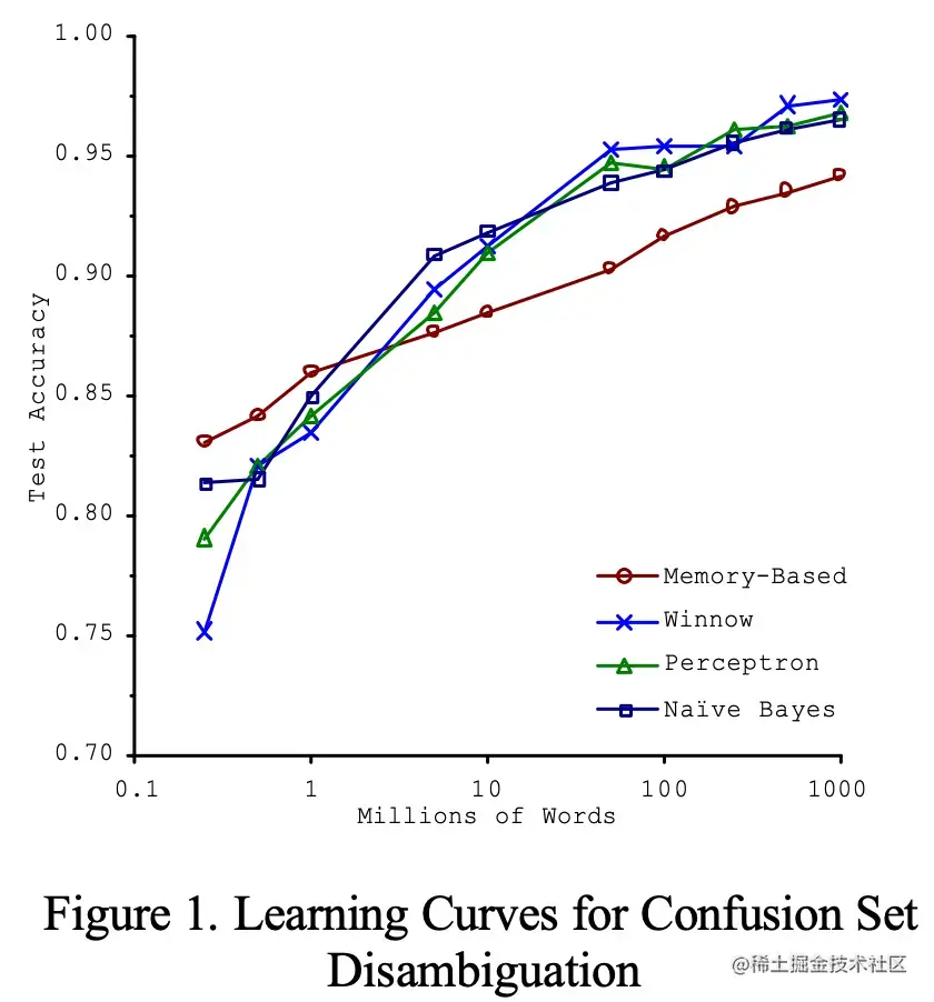 - 2001年一个关于自然语言歧义消除的研究 Scaling to very very large corpora for natural language disambiguation 中发现,在数据足够多的情况下(比如10亿),即使是非常简单的模型(右图中 Memory-Based 红线),也能在这种复杂问题中表现良好。