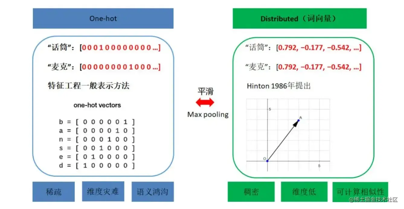 那么embedding 其实就是一种稠密向量的表示形式。在 embedding 大行其道之前 oneHot 才是最靓的仔。如果和我们比较熟悉的 oneHot 对比起来理解,顿时会发现 embedding 这个玄里玄乎的概念,实际上 so easy。直观上看 embedding 相当于是对 oneHot 做了平滑,而 oneHot 相当于是对 embedding 做了 max pooling。