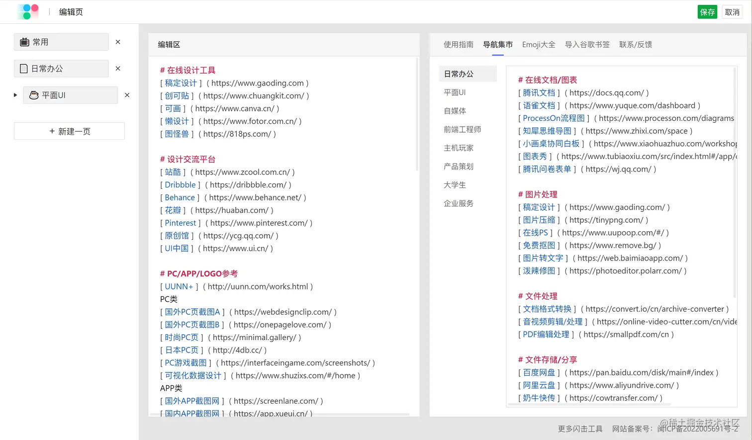 - 提供各行各业的常用网址。 我们去收集了各行各业常用的网站(比如设计师、前端工程师、主机玩家、产品策划、自媒体等角色的常用网站),你只要复制到你的编辑区,就能为你所用,省去你收集的时间。