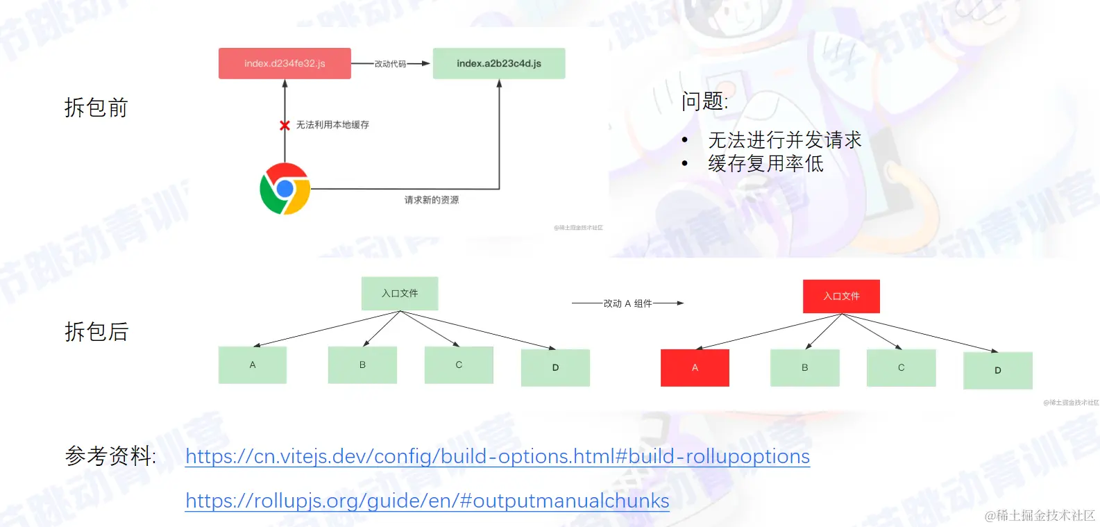 前端组成主要由逻辑代码、样式代码、 静态资源三个部分组成。开发过程中经常会遇到模块化、语法转译、产物质量和开发效率这四个方面上的问题。