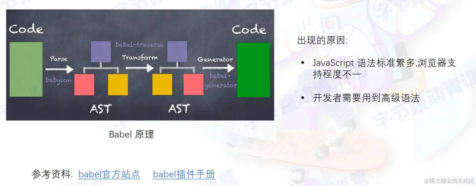 | 语法转议 | 1、高级语法转译,如SASS、TS 2、资源加载,如图片、字体、worker |