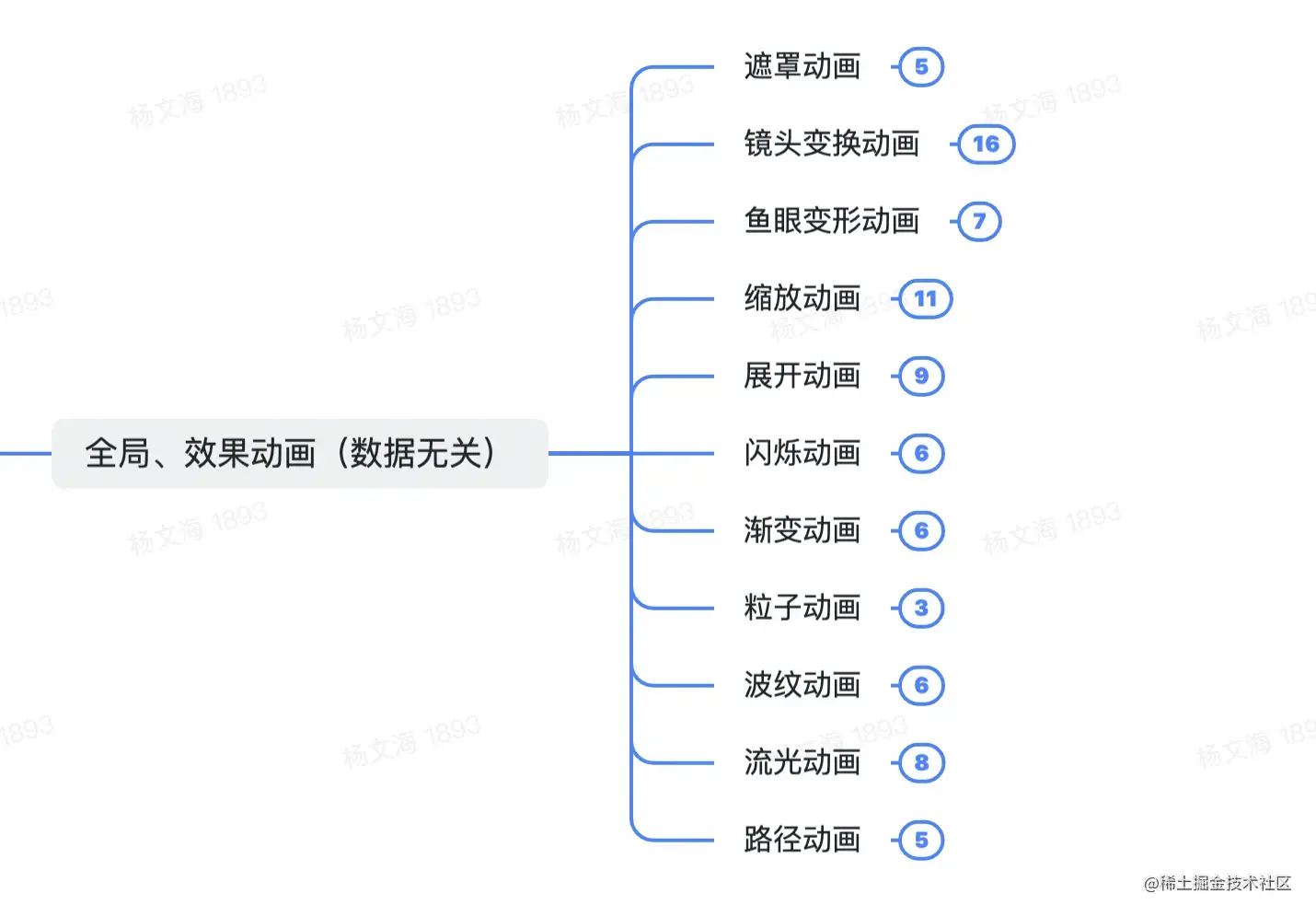 根据动画的对象,我们可以将动画分为图元动画、组件动画和全局动画。同时,人们也对经常使用的动画效果进行了抽象和总结,比如缩放、旋转、飞入、飞出等。根据动画的实际又有入场、出场、更新等分类方式。