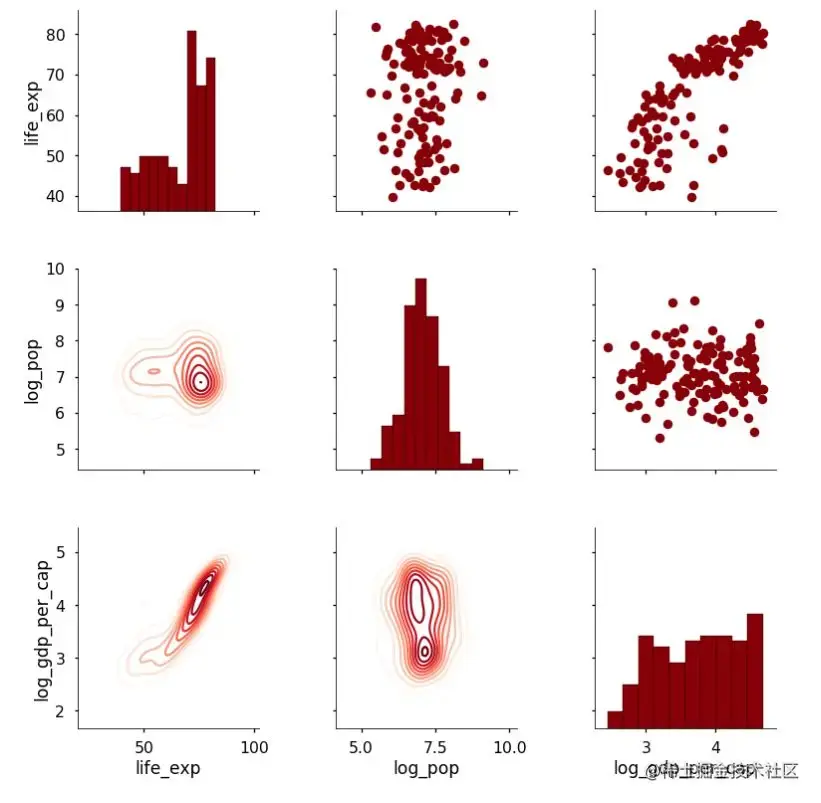 每一行代表一个国家一年的观察数据,列代表变量(这种格式的数据被称作整洁数据,tidy data),其中有两个类别列(国家和洲)和四个数值列。这些列简单易懂:life_exp 是出生时的预期寿命,以年为单位,popis 是人口数量,gdp_per_cap 是人均 GDP(以国际元)为单位。只考虑数值类型属性之间的关系, 可生成如下的散点图矩阵: