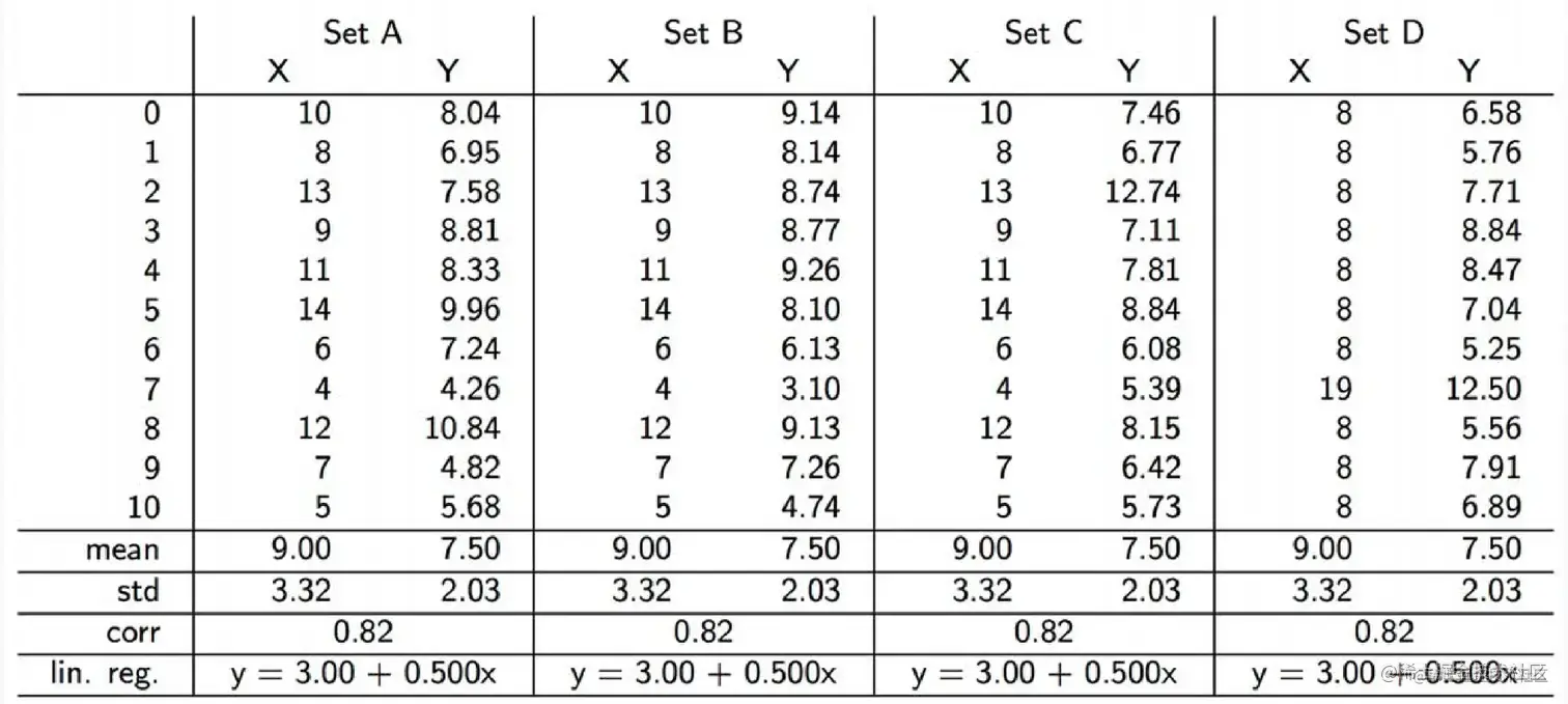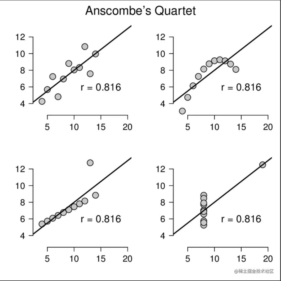 (Anscombe's quartet)是四组基本的统计特性一致的数据,但由它们绘制出的图表则截然不同。每一组数据都包括了11个(x,y)点。这四组数据由统计学家弗朗西斯·安斯库姆(Francis Anscombe)于1973年构造,他的目的是用来说明在分析数据前先绘制图表的重要性,以及离群值对统计的影响之大。