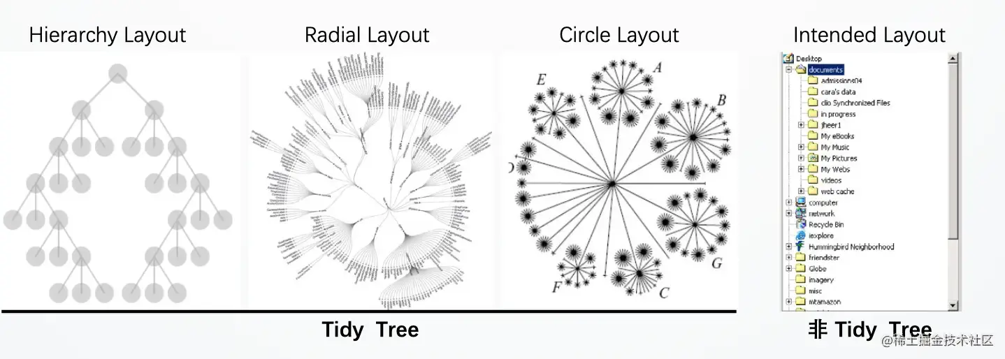 通过可视化节点之间的相邻位置关系以展现树的拓扑结构,节点的大小,宽度,可以用来展现另外一个数据维度。