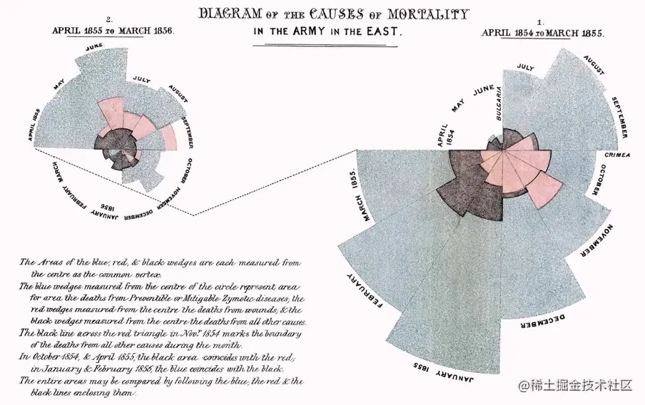 由于可视化可以高效的阐释数据内含,合理的可视化设计可以更好的帮助作者表达其观点。比如下方的“南丁格玫瑰图((en.wikipedia.org/wiki/File:N…%25E2%2580%259D%25EF%25BC%258C "en.wikipedia.org/wiki/File:N…")