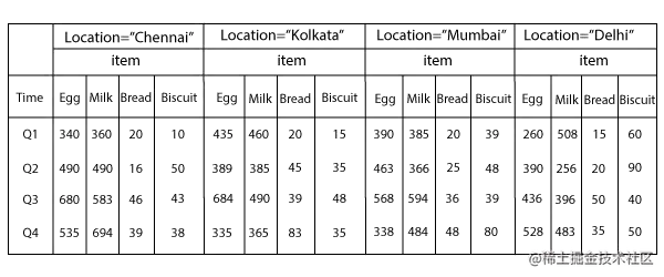 下图所示的一个多维表格数据,我们通过简单的行号或者选取一个键都没办法确定一个明确的数据条目,比如我们想得到一个销售值,那么应该描述成为“ Timeid 为1,pid 11 的销售值为25”,更复杂的数据需要更多的键来组合定位。