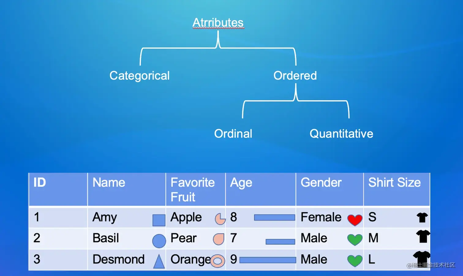 数据集中的数据条目都会包含一个或者多个属性(Attribute),属性分为分类(Categorical)和排序(Ordered)属性。排序属性又分为顺序(Ordinal)和定量(Quantitative)两种类别。