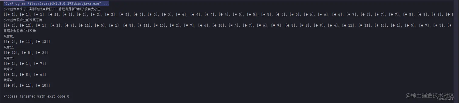 这里我们将5位玩家的牌也放在ArrayList中并且放在ArrayList<ArrayList>类型的数组中你细细品players的每一个元素类型是一个ArrayList,我们将他们组合在一起就是一个二维数组