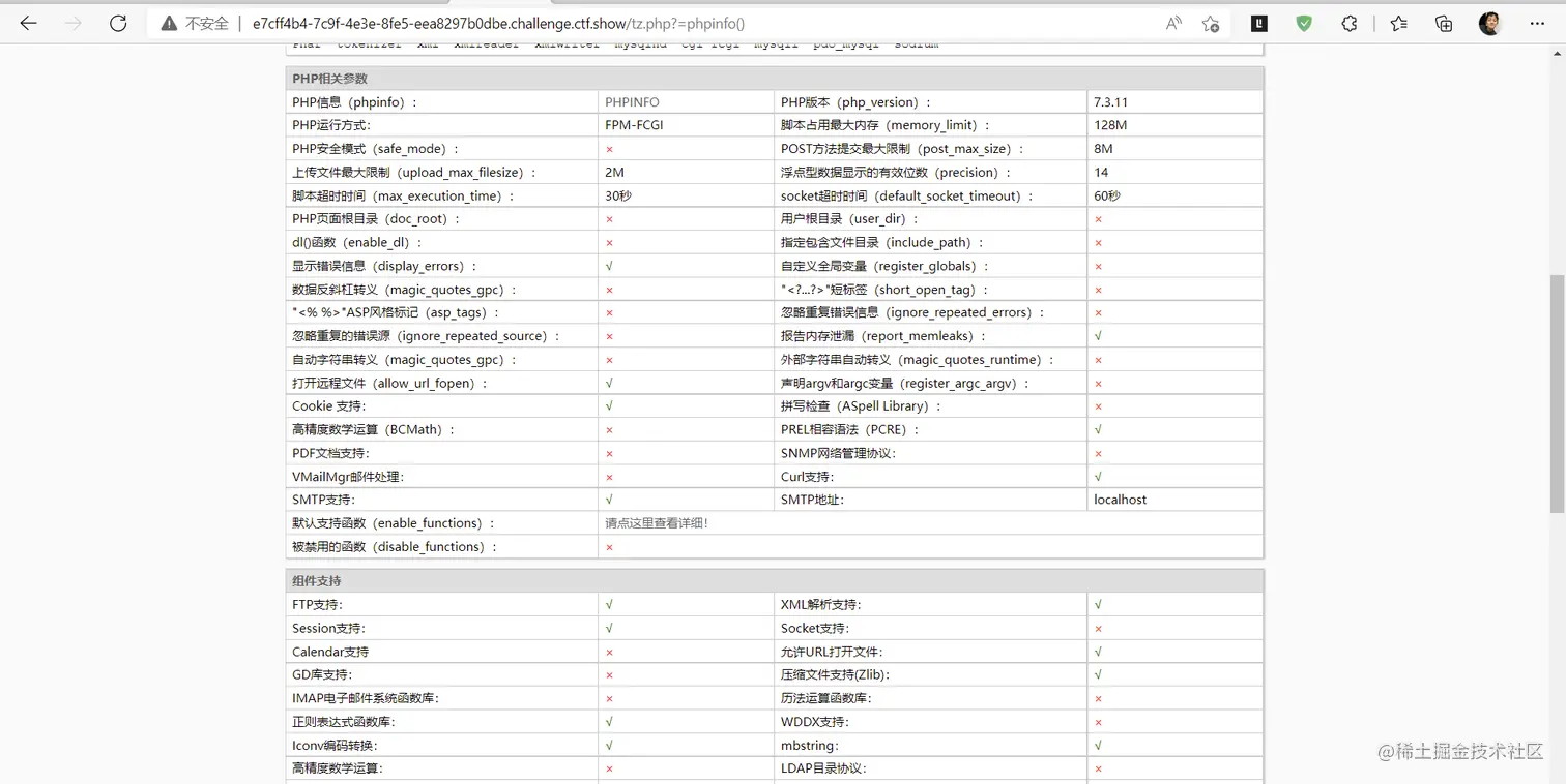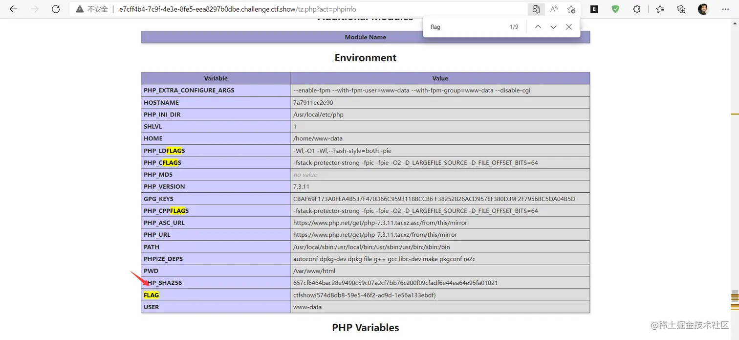 这里在url里输入/tz.php?act=phpinfo,然后直接ctrl+f搜索flag。
