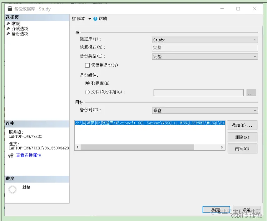 (6)利用企业管理器的数据库备份功能,将以上建立的数据库Study备份到所建立的文件夹中,并将备份文件拷贝到U盘中,以备下面的题目使用。