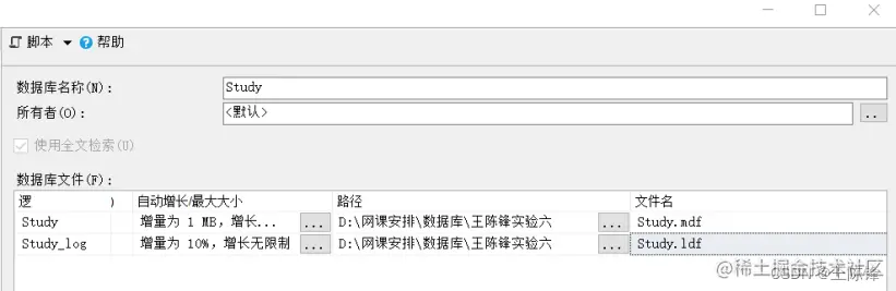 - 利用企业管理器建立名称为Study的数据库文件,主文件名为Study.mdf,日志文件名为Study.ldf,它们的保存路径在第(1)步中建立的文件夹。