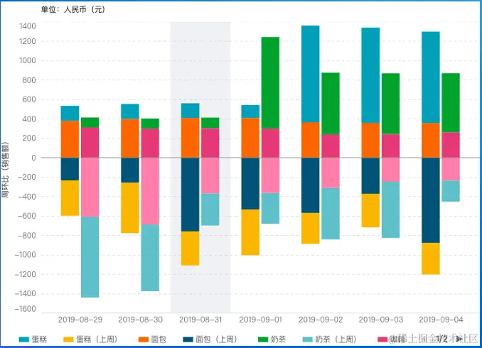- 空间中距离相近的元素有被看作一体的趋势。人们会很自然的根据距离来对视觉对象进行分组。下图的分组柱形图,我们会很自然的把临近的柱子分为一组,其次才是观察颜色分组。