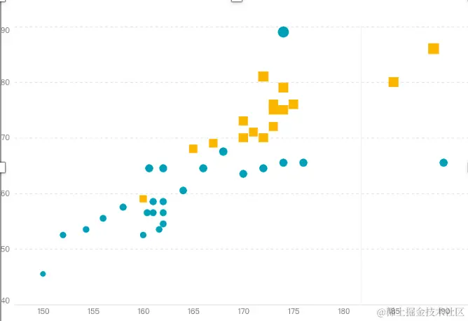 - 刺激物的形状、大小、颜色、强度等物理属性方面比较相似时,这 些刺激物就容易被组织起来而构成一个整体。如下图中,根据颜色和形状,将数据分为两组。