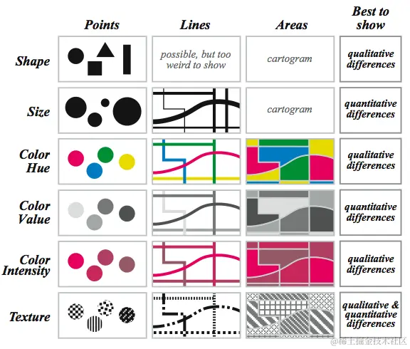选取了Mark之后,需要进一步描述Mark的具体视觉特性,这些特性称之为视觉通道(Visual Channels),视觉通道有很多,下图以6种通道和3种Mark相组合,可以很直观的体会二者之间的关系。